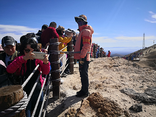 早上8点,已经挤满了观赏天池的游人,突然有名游客急切的喊“我的手机掉入下去了”,主峰工作人员听到呼救立刻上前了解情况,原来一名游客在使用手机拍摄天池美景时,不慎将手机掉入涯边。只见一名穿着橘红色工作服的中年男子,扎了扎身上的安全绳,在众人的目光中,选定了位置,熟练且谨慎地滑下悬崖……,经过短暂时间的摸索,终于将游客的手机找到并安全带回。很多不明真相的游客对着他拍照,以为他是一名“探险家”,但实际上他真正的身份,是一名清洁工。他就是被人们称为长白山主峰的“蜘蛛人”之一。而像这样的的“探险行动”,紧紧是主峰工作人员的工作日常。