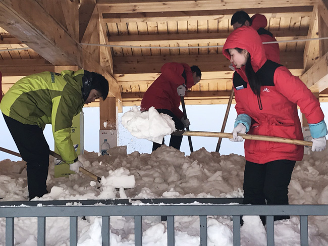 2017年3月5日,40余名志愿者在北景区老山门候车亭前集合,前往瀑布回廊清雪。长白山由于特殊的地理位置和气候,冬季雪期长、雪量大,经过一年积淀,回廊内积雪平均厚度已达1.5米,面对艰巨的任务,志愿者们用高涨的热情对抗天寒地冻,经过个6小时的奋战,下午三点回廊积雪被清扫一空,为迎接游人的到来做好了准备。
