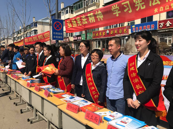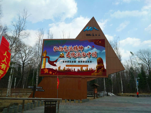 4月25日,为提高宪法宣传的实效性,在长白山西、北景区大屏幕投放了宪法宣传图片。同时,在场区小市场人员密集场所通过悬挂宪法宣传条幅、宣传展板、发放宪法宣传资料、摆放咨询台等形式,帮助广大群众及时了解宪法修正案的内容,增强宪法意识。
