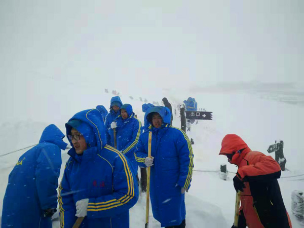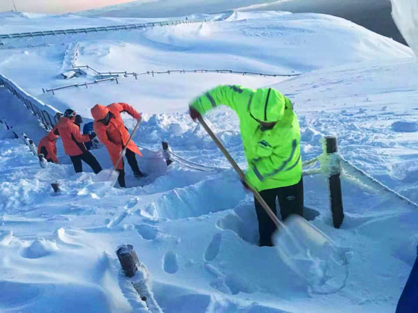 各种清雪机械加足了马力,来自主峰管理部和运营一部的160多名员工飞舞着铁锹、扫帚轮番上阵,大家顶风冒雪、辛勤劳作,片片雪花落到脸上、身上,汗水湿透了他们的工装,却丝毫没有影响他们的干劲。清雪工作异常艰苦,连续两天工作到夜晚,为了加快进度,部分党员和员工住在主峰服务区,早晨3点多就继续清理公路上的冰雪,经过两天的奋战,最终完成了此次繁重的清雪防滑任务,天池主峰公路于10月3日上午正常通车,满足了万千游客国庆假期一睹雪域长白的美好愿望,保障了黄金周期间运行的顺畅。