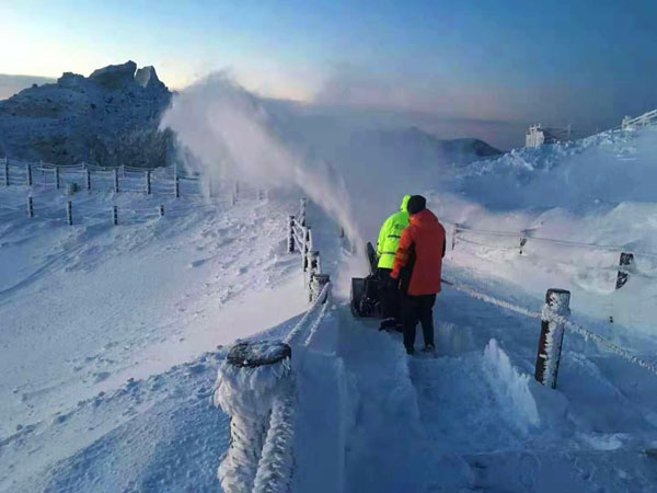 大雪连下两天,封住了主峰的路,为尽快的让游客们领略天池美景,公司投入了大量的人力、物力进行了一场“安全防滑、速保畅通”的清雪攻坚战。
