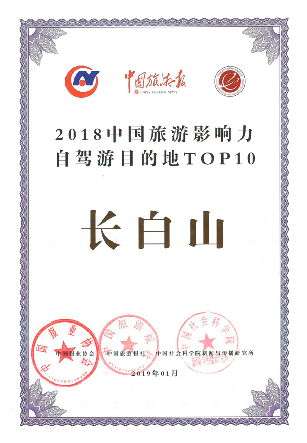 经文化和旅游部批准,由中国报业协会指导、中国旅游报社主办、中国社会科学院新闻与传播研究所学术支持的“2019中国旅游产业年会”于2019年1月23日在北京亮马河会议中心举行,长白山被授予2018中国旅游影响力自驾游目的地TOP10。